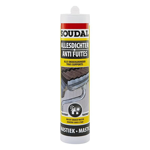 Omschrijving 310ML ALLESDICHTER DAK N/F Extra informatie Merk: Soudal Referentie: 101532 Verpakking: koker Kleur: Transparant Items per overdoos: 12